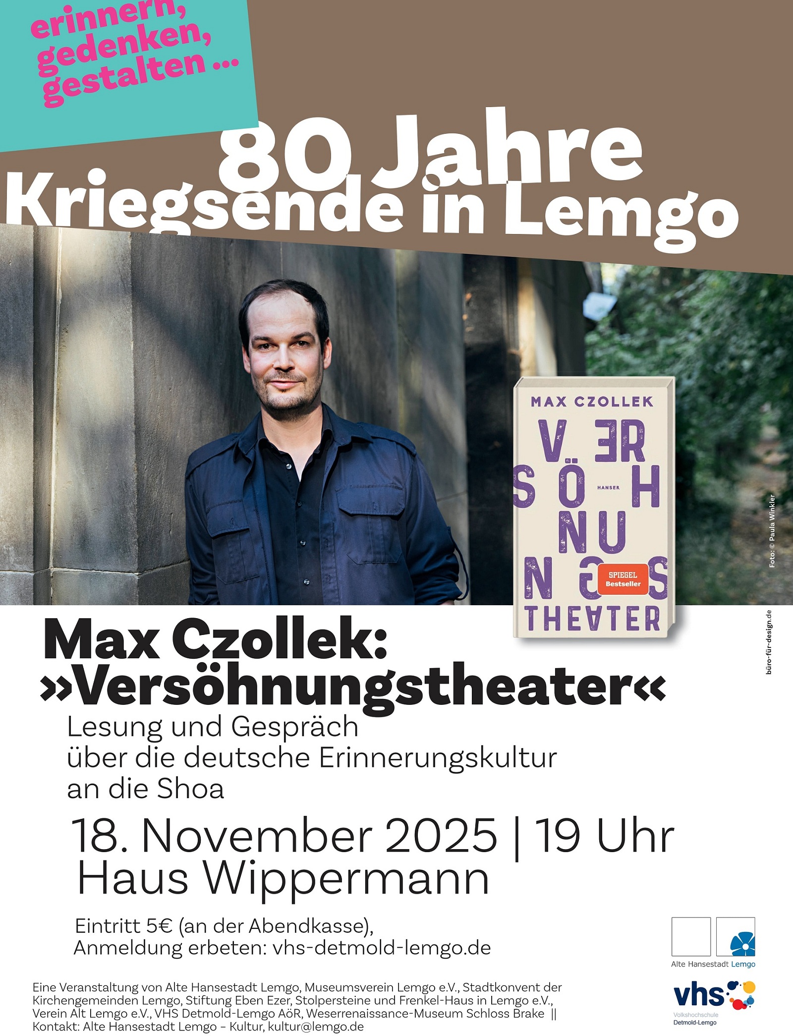 Die Veranstaltung ist Teil der Reihe „80 Jahre Kriegsende in Lemgo“ und findet passenderweise auch kurz nach dem Gedenktag am 09. November statt. Der Eintritt kostet 5€. Um Anmeldung über vhs-detmold-lemgo.de wird auf Grund der begrenzten Platzzahl gebeten.