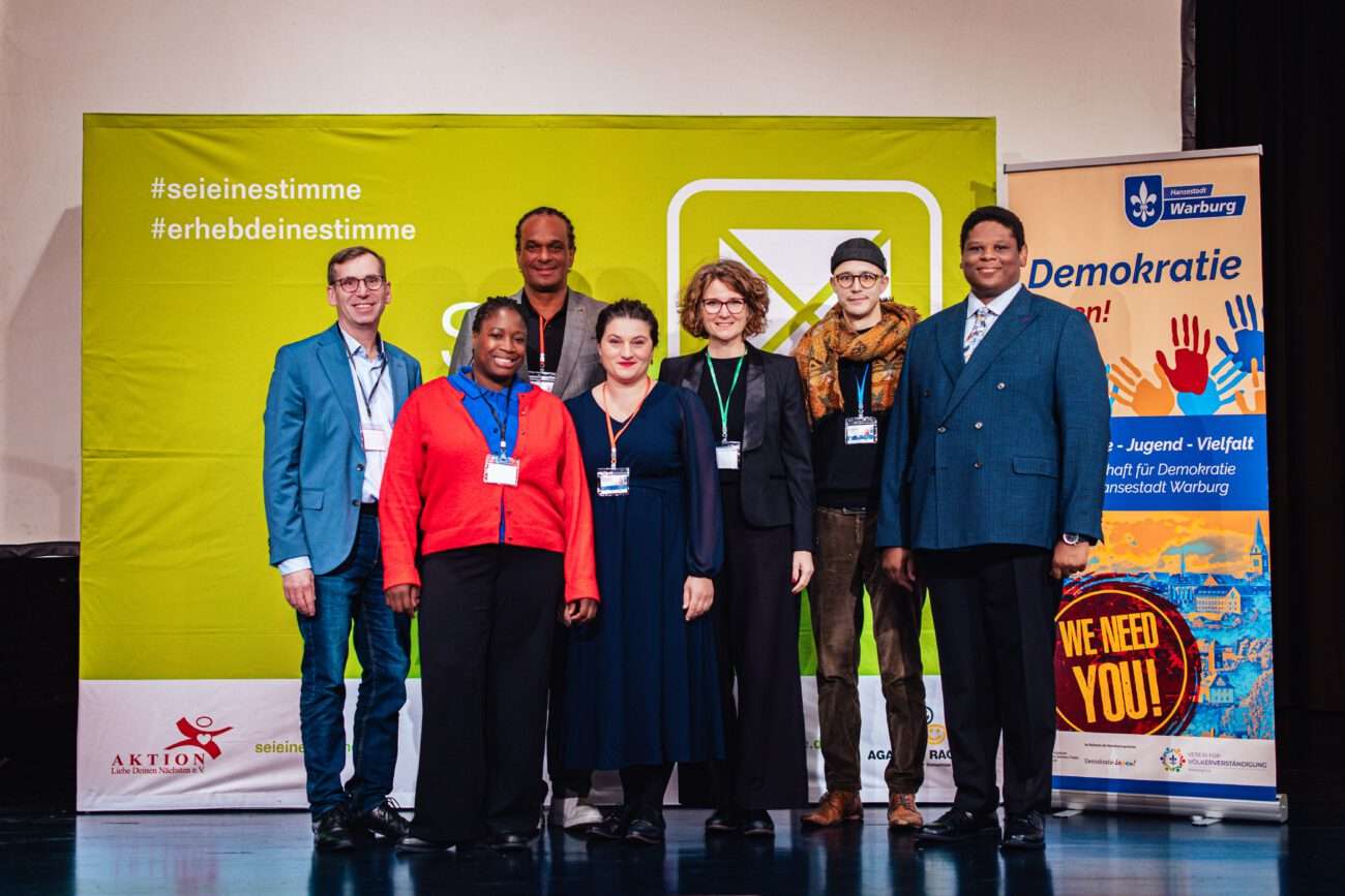 Gemeinsam für mehr Offenheit, Teilhabe und Gemeinschaft: (von links): Bürgermeister Tobias Scherf, Autorin und Bildungsaktivistin Olaolu Fajembola, Sänger und Rapper Martin Rietsch („2schneidig“), Koordinatorin Semira Klenk, Antidiskriminierungspädagogin Miriam Nadimi Amin, Sozialwissenschaftler Max Barnewitz und Prof. Dr. Lorenz Narku Laing +++ Foto: Arr-Hart