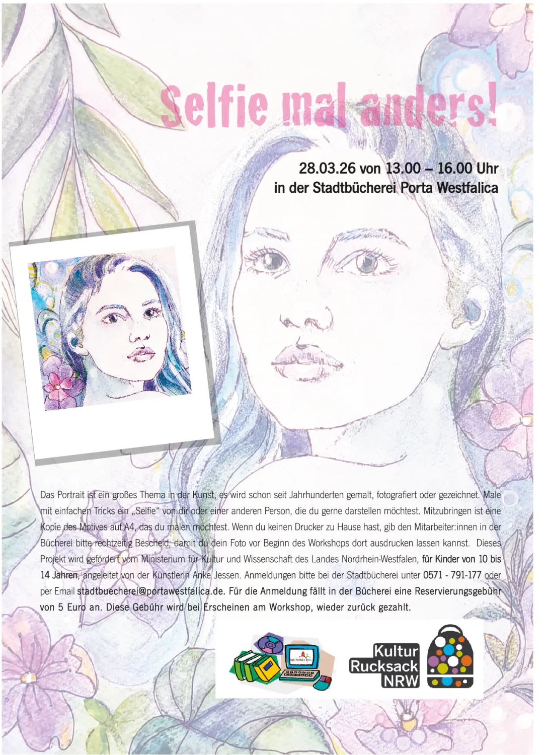 Die Künstlerin Anke Jessen bietet in der Stadtbücherei Porta Westfalica wieder einen Workshop für 10 bis 14-Jährige an. Dieses Mal geht es um ein großes Thema in der Kunst, das Portrait oder Selbstportrait. Allerdings muss heute niemand mehr mit dem Spiegel hantieren, sondern die Vorlage für das Kunstwerk wird aus einem Foto erstellt. Mit einfachen Tricks wird aus einer Fotokopie in A4-Größe ein handgemaltes, coloriertes Bild von dir oder jemandem, den du malen möchtest. Wem kein Drucker zur Verfügung steht, kann das Selbstportrait gegen eine kleine Gebühr in der Stadtbücherei ausdrucken.