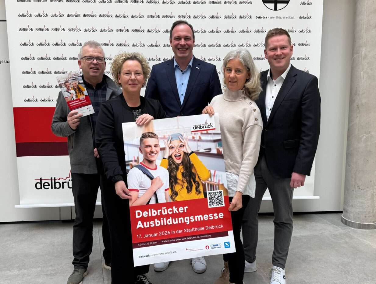 Delbrücks Zukunft im Blick: Bürgermeister Johannes Lindhauer (hinten Mitte) wirbt gemeinsam mit Björn Venker von der Sparkasse Paderborn-Detmold-Höxter (hinten rechts), Nicole Glawe Miersch vom BANG StarterCenter (vorne rechts), Christiane Rolf von der Stadt Delbrück (vorne links) und Stefan Brand von der Techniker Krankenkasse (hinten links) für die